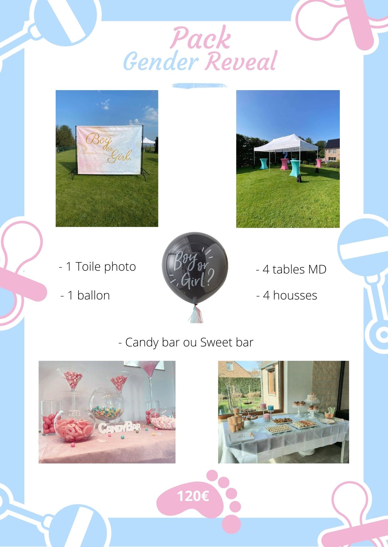Découvrez notre pack Gender Reveal à un tarif avantageux comprenant les éléments suivants :